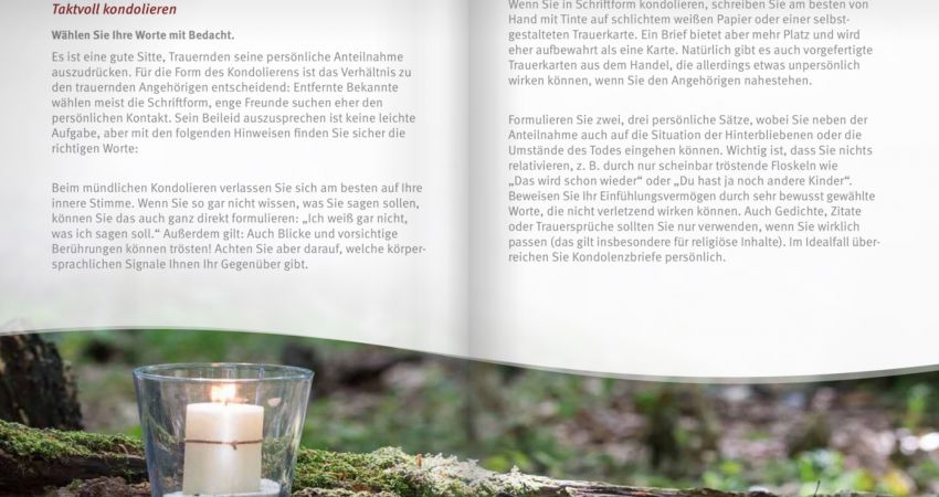 Jeder Sterbefall bringt sowohl die nächsten Angehörigen als auch Freunde und Bekannte in eine ungewohnte Situation, die häufig von Unsicherheit und Angst geprägt ist. Wir haben für Sie einige Informationen zusammengestellt, die Ihnen in dieser Situation nützlich sein sollen.